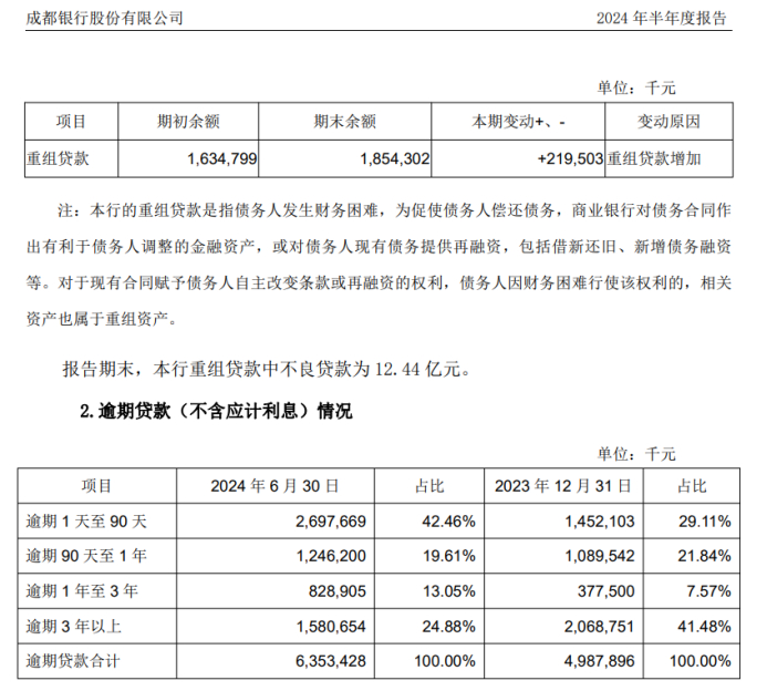 更值得关注的是,成都银行在不良贷款率下滑的同时,重组贷款和逾期贷款却出现了较快增长。仅以2024年半年报为例,至2024年6月底,成都银行的重组贷款较年初就增加了2.2亿元至18.54亿元,重组贷款中不良贷款12.44亿元。