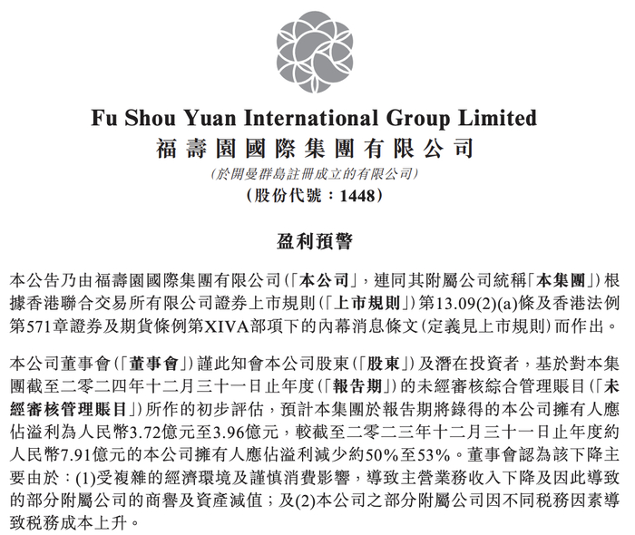 3月14日,福寿园发布盈利预警,公告内容显示,预计截至2024年12月31日的年度,本公司将录得归母净利润为3.72亿元至3.96亿元,较截至2023年12月31日的本公司归母净利润约7.91亿元减少约50%至53%。