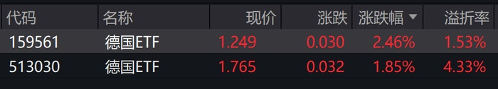 受盘面影响,今日早盘两只德国ETF涨约2%,出现小幅溢价。