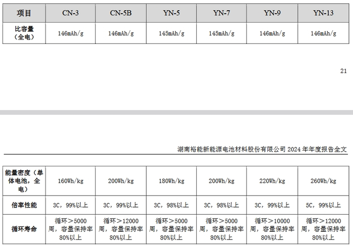 报告期内,湖南裕能推出的 CN-5 系列、YN-9 系列新产品不断完善性能,市场拓展取得了突破性的进展。CN-5 系列兼具长循环寿命和低温性能优异等特性,契合大电芯储能电池对电池全生命周期价值提升的追求。YN-9 系列在实现高压实密度的同时,有效保障材料的容量发挥和倍率性能,较好地满足了动力电池在高功率输出和快速充放电方面的高性能需求。同时,公司研发的更新一代高性能产品 YN-13 系列也取得了重要成果,已通过重要客户认证,并实现批量供货。YN-13 系列产品凭借超高压实、高容量,能够大幅度提升电芯的能量密度,从而更好地满足高端动力和高端储能应用需 求。2024 年,公司新产品 CN-5 系列、YN-9 系列和 YN-13 系列实现销售 15.93 万吨,在公司产品销量占 比中达到约 22%。此外,在磷酸锰铁锂产品研发上,公司产品纯用及混用方案均获客户高度认可,研发进展顺利。富锂锰基正极材料的中试样品在固态电池体系评估进展顺利,得到客户的好评。