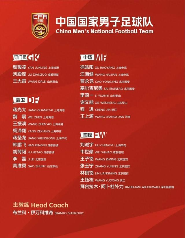 中国队公布的大名单中,除了有伤在身的朱辰杰、武磊外,王大雷、张玉宁、韦世豪、蒋光太等主力球员悉数在列。参加了集训的韩佳奇、侯永永、吴少聪、汪士钦、刘浩帆、徐彬、黄政宇落选。