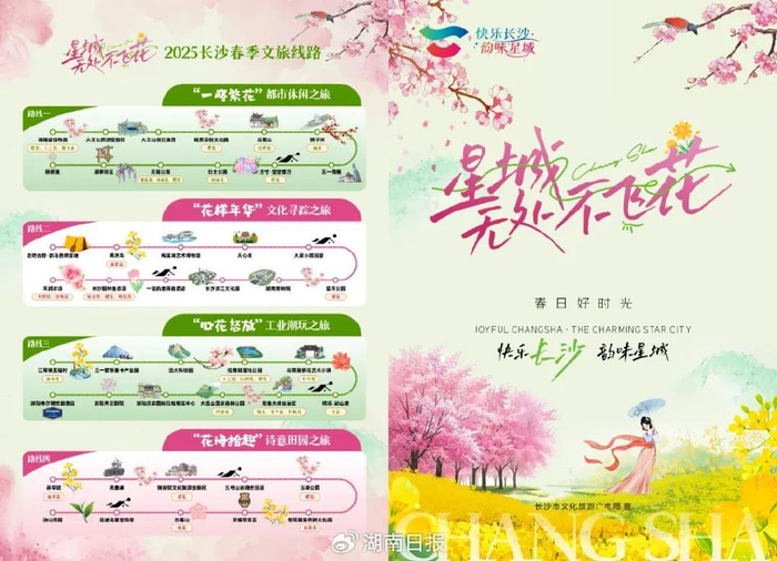 湖南省植物园(樱花、玉兰花、郁金香)——大王山旅游度假区——大王山假日酒店——晚安家居文化园(樱花)——岳麓山(杜鹃花)——橘子洲(梅花)——五一商圈——方寸·空空客厅(民宿)——烈士公园(绣球花)——潮宗街区——月湖公园(紫藤花、绣球花、樱花)——颐而康