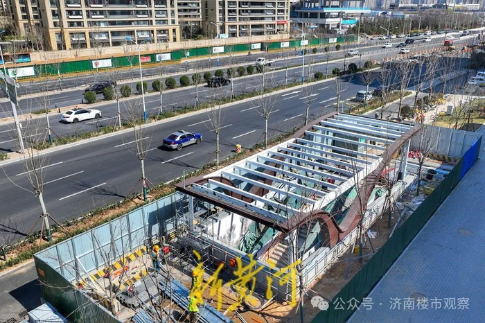 目前,4号地铁线部分车站的出入口钢结构已经初露真容,施工人员正在进行焊接工艺,包括小高庄站、青岛路站等。