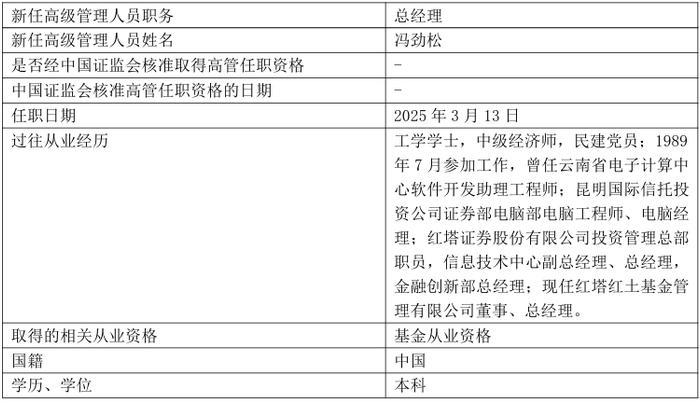 除了贝莱德基金,红塔红土基金近日也公告,新任冯劲松为公司总经理。