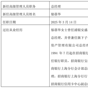履历显示,郁蓓华曾任浦银安盛基金总经理,并曾兼任旗下子公司上海浦银安盛资产管理有限公司总经理。公开信息显示,郁蓓华在2024年7月1日离任浦银安盛基金总经理。