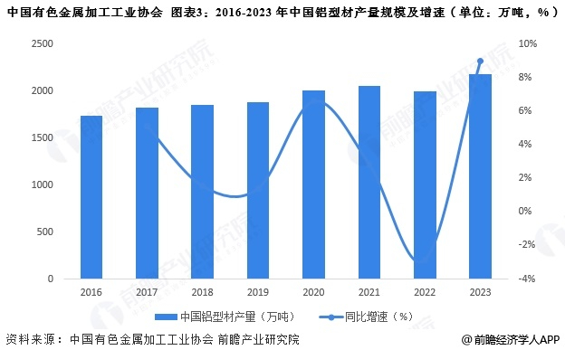 根据中国有色金属加工工业协会统计,2016-2023年,中国铝型材累计产量缓慢增长。2023年,中国铝型材产量为2180万吨,同比增长了约9%。