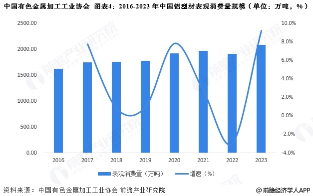 根据我国铝型材产量、进出口量计算得到我国铝型材表观消费量,2016-2023年,中国铝型材表观需求量整体呈增长趋势。2023年,我国铝型材表观需求量达2084.44万吨,同比增长9.2%。国内需求量较大,这主要得益于中国庞大的消费者数量、车市等终端消费市场的迅速发展。