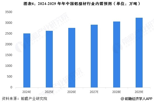 随着中国铝型材行业的快速增长,铝型材行业的销售收入也将逐年增加。根据我国建筑铝型材和工业铝型材需求的发展,预测出2024年-2029年我国铝型材市场内需规模,2029年我国铝型材内需规模约为3240万吨,年复合增速约为5.2%。