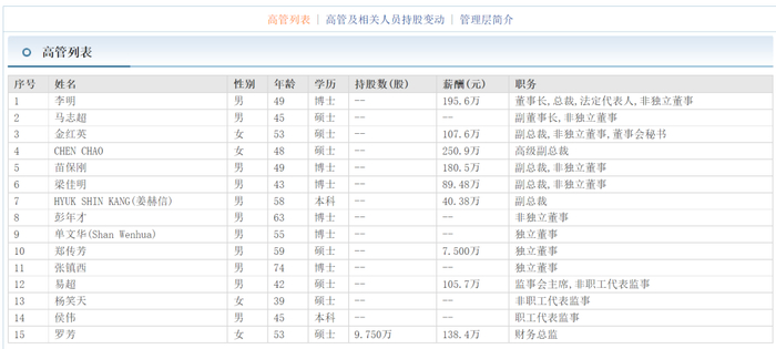 CHEN CHAO 女士,1977 年出生,新加坡国籍,中欧国际工商学院高级工商管理硕士,国际会计师(ACCA)、新加坡注册会计师(CPA),曾分别担任美国纳斯达克上市公司、日本东京证券交易所上市公司执行董事、董事、财务总监等职务,拥有二十多年药品研发、石油、机械制造业、金融等行业跨国公司经营管理、财务、内控审计、战略投资及企业兼并购经验, 曾任公司董事、总裁,现任公司高级副总裁。资料显示,CHEN CHAO 女士任职时间从2023年4月3日开始,薪酬为250.9万。