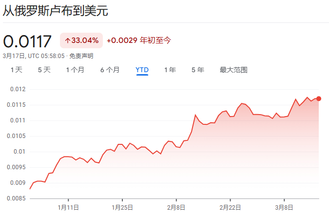 最明显的趋势是,今年以来,俄罗斯卢布兑美元汇率已经飙升超过33%。