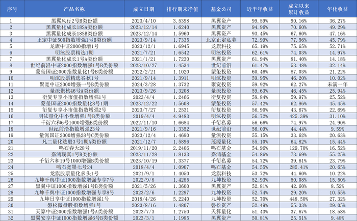 正定私募旗下的“正定中证500指数增强1号B类份额”近半年的收益率为72.99%,排名第四位,龙旗科技的“龙旗中证2000指增1号”、明汯投资的“明汯股票精选1期”、世纪前沿的“世纪前沿中证2000指数增强1号B类份额”、蒙玺投资的“蒙玺国证2000指数量化1号B类份额”近半年的收益率也都超过了60%。