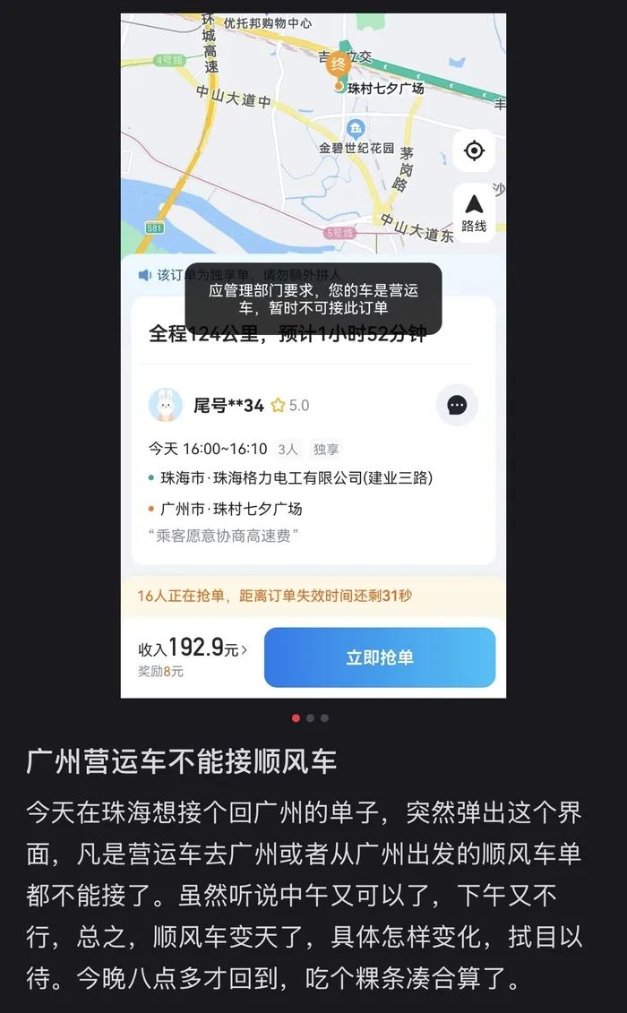 近日,有广东多地司机在社交媒体平台上表示,在接顺风车时被平台提示“应监管要求本市顺风车服务暂时关闭”或“应管理部门要求,因您的车是营运车,暂时停止接单服务”。有乘客也反馈,起始点在广州的顺风车订单一直无人接单。