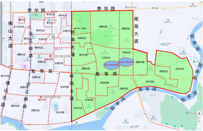 2025年招生计划人数为560人,与去年持平,统筹安排符合有关文件规定的优教服务对象子女,剩余55%面向就近入学片区范围招生,就近入学片区范围是指学生本人的户籍地址在岭南大道以东、季华路以南与东平路围合的禅城区范围(如下图绿色区域所示),剩余招生计划的45%面向全区(就近入学片区范围以外的禅城区户籍生)招生。