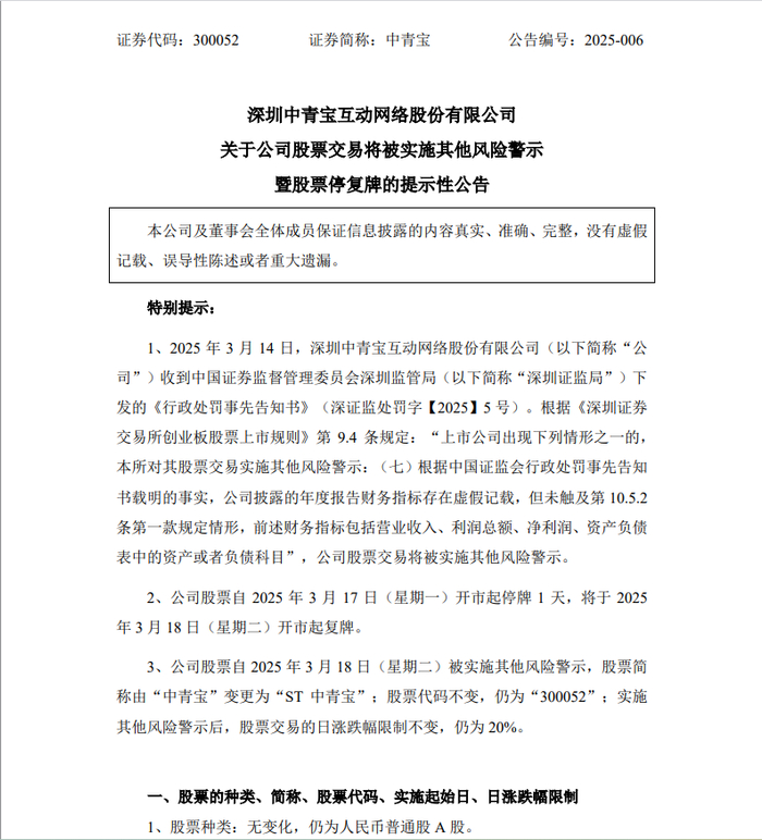 3月16日晚间,“网游第一股”中青宝(SZ300052)发布关于公司及相关当事人收到《行政处罚事先告知书》的公告及公司股票交易将被实施其他风险警示暨股票停复牌的提示性公告。