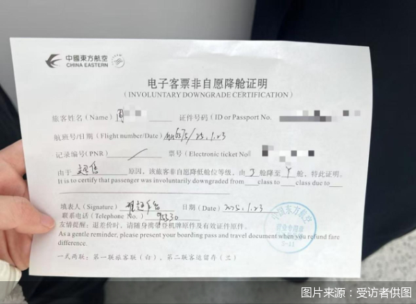 迫于无奈,宋欣欣最终签署了东航给出的《非自愿降舱补偿确认书》,选择让丈夫前往经济舱。