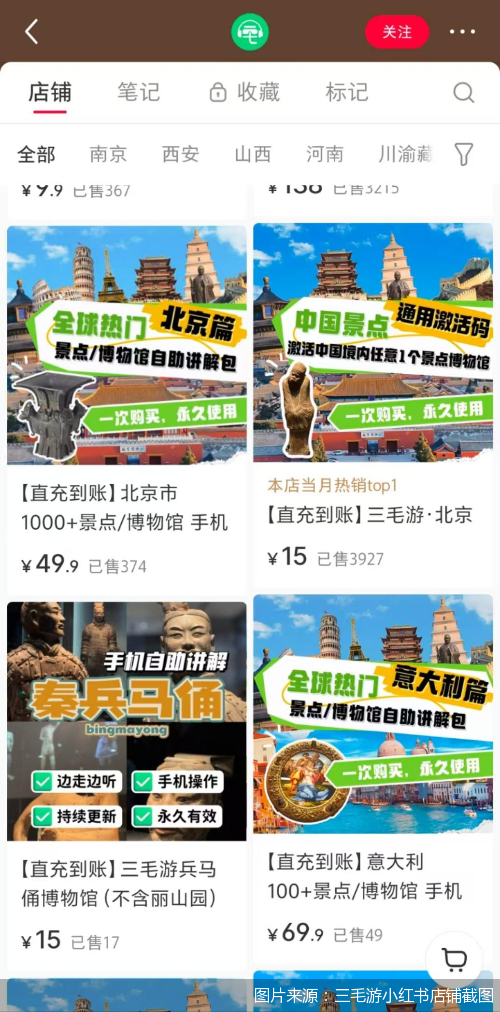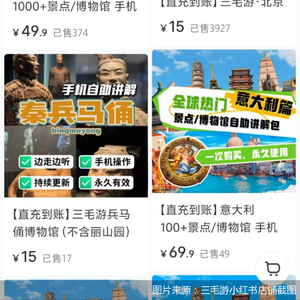 在三毛游的小红书官方店铺里,北京商报记者看到有很多标注了“直充到账”字样的自助讲解包。例如“【直充到账】广汉三星堆博物馆自助导览讲解”等。其小红书店铺客服表示,直充到账是指“下单后自动充值进预留的手机号账户中”,也就是购买哪个景区或博物馆的讲解,就单独解锁其App里对应的线上讲解语音包。