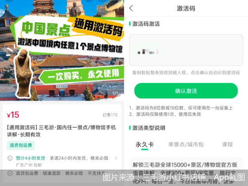 三毛游的淘宝店铺客服表示,这款7元的激活码对应的就是App内价值9.9金币的天坛公园三毛游官方线上讲解,拍下产品后既可以给客服发手机号选择直充,也可以用激活码在App激活线上讲解语音包。