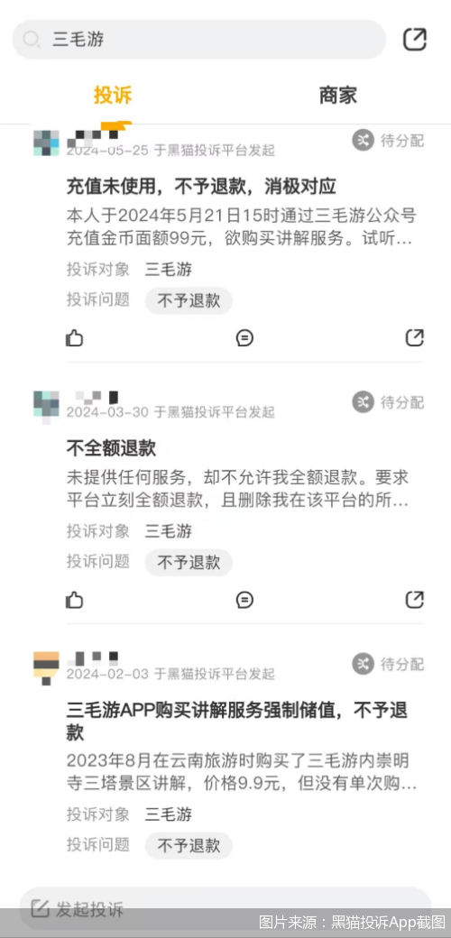 2024年2月3日,陈瑜在黑猫投诉平台发起了投诉。截至2月26日,黑猫平台仍显示,消费者投诉的商家三毛游“未匹配成功”,投诉仍未被解决。