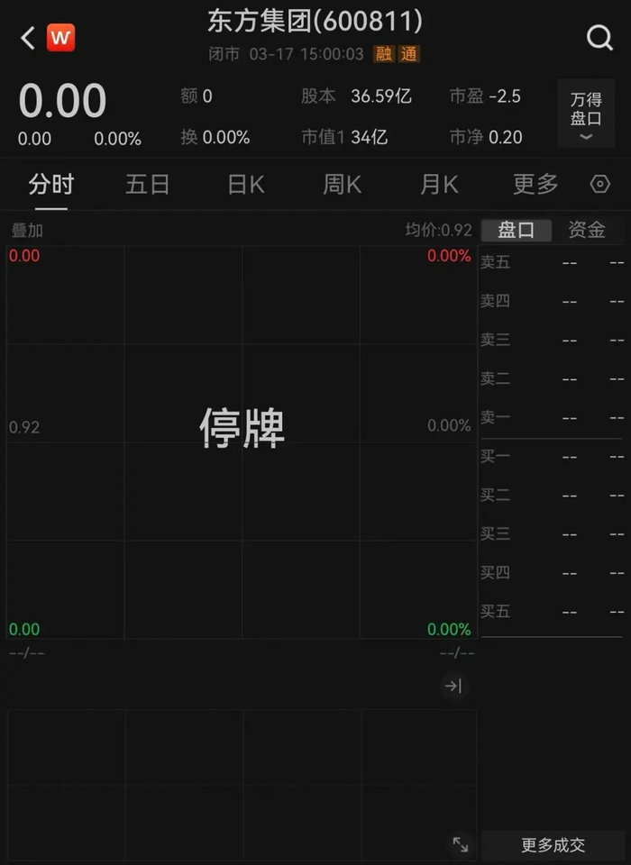 3月14日,东方集团股价封一字跌停板,报收0.92元/股,时隔近九个月再次回落至1元红线之下。根据上市规则,若东方集团连续20个交易日的每日股票收盘价均低于1元,公司股票可能被上交所终止上市交易。