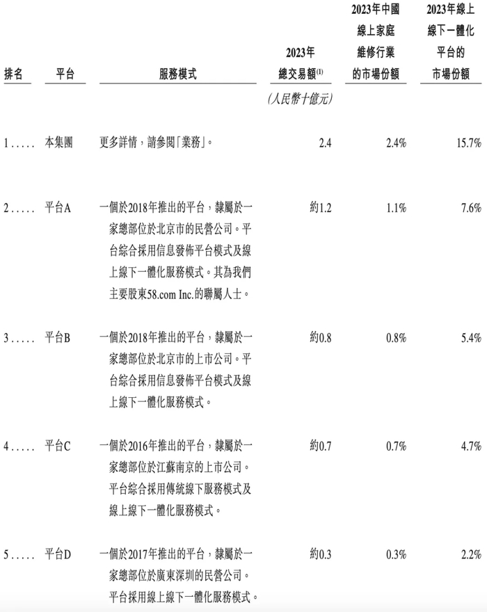维修行业竞争激烈且高度分散,一大特征就是“大行业、小企业”。截至2023年,按总交易额计算,啄木鸟即使是中国最大的线上家庭维修企业,线上市场份额也不过仅有2.4%,线上线下一体化平台的市场份额也仅有15.7%。根据其招股书,推测出后面四名或许是58到家、京东到家、苏宁帮客、闪修侠。