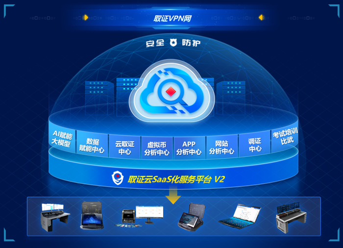 取证云平台是取证装备的指挥和赋能大脑,提供数据赋能、AI赋能、知识库赋能等能力支撑,提供云取证、调证、APP分析和区块链虚拟货币分析等SaaS化的取证服务,提供设备升级、小程序共享和案事件协助等服务,为前端取证装备提供强大赋能,打造全新的取证模式。