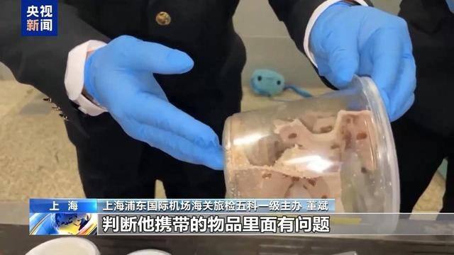 上海浦东国际机场海关旅检五科一级主办 董斌:这个人神情非常紧张,走路的姿势,包括面部表情都与其他正常旅客不一样。再结合CT机图像,审图,判断他携带的物品里面有问题。在行李箱里看到大大小小塑料罐,微小青蛙的形状,还有其他昆虫的形状。在他的手提包里也发现了这样的罐子,并且有相似类型的物种。