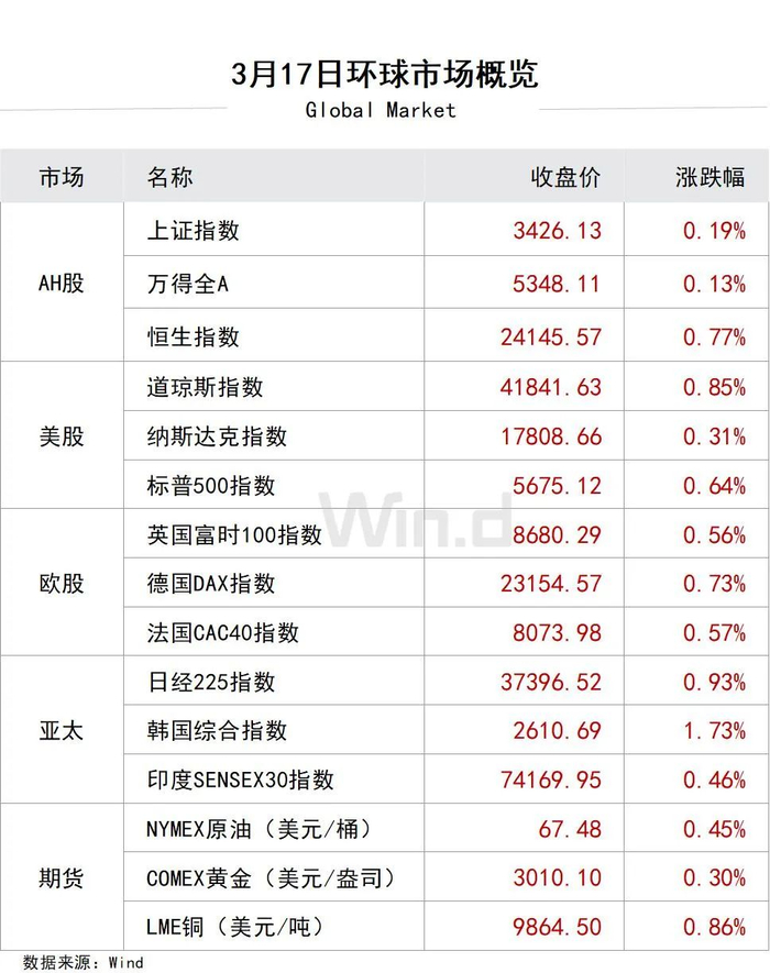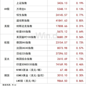 2、欧洲三大股指收盘全线上涨,德国DAX指数涨0.73%报23154.57点,法国CAC40指数涨0.57%报8073.98点,英国富时100指数涨0.56%报8680.29点。