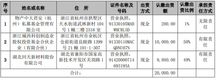 回天新材与物产中大君安(杭州)私募基金管理有限公司、浙江城西科创制造业股权投资基金合伙企业(有限合伙)订了《君安回天(杭州)股权投资合伙企业(有限合伙)合伙协议》,共同设立君安回天(杭州)股权投资合伙企业(有限合伙)。该基金规模为2亿元,各投资人出资情况如下: