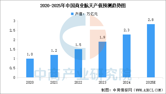近年来,中国政府积极鼓励商业航天行业发展。中商产业研究院发布的《2025-2030年中国商业航天行业深度分析及发展前景研究预测报告》显示,中国商业航天行业产值由2020年1万亿元增至2024年的2.3万亿元左右,复合年增长率为22.9%。中商产业研究院分析师预测,2025年中国商业航天行业产值将达到2.8万亿元。