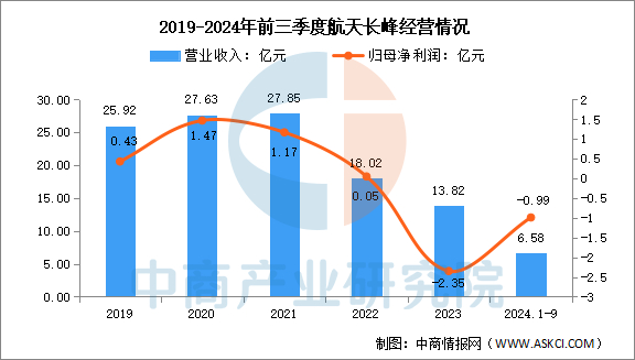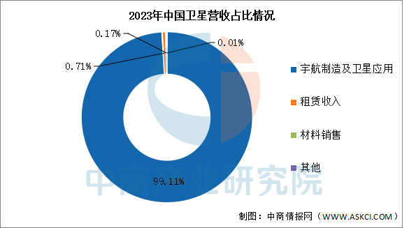 2024年前三季度实现营业收入16.74亿元,同比下降54.42%;归母净利润亏损0.15亿元。2023年主营产品包括宇航制造及卫星应用、租赁收入、材料销售,营收分别占整体的99.11%、0.71%、0.17%。