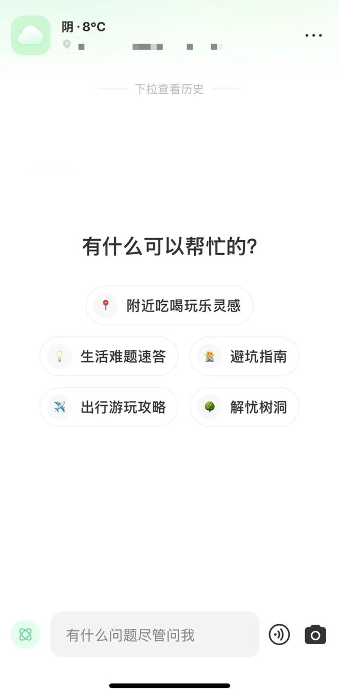 点点的主页面注重定位信息且十分简洁,主页面仅有搜索框,“有什么可以帮忙的?”引导用户发问,以及在此之下几个常见的生活问题标签来充当常规应用中的类目导航栏。