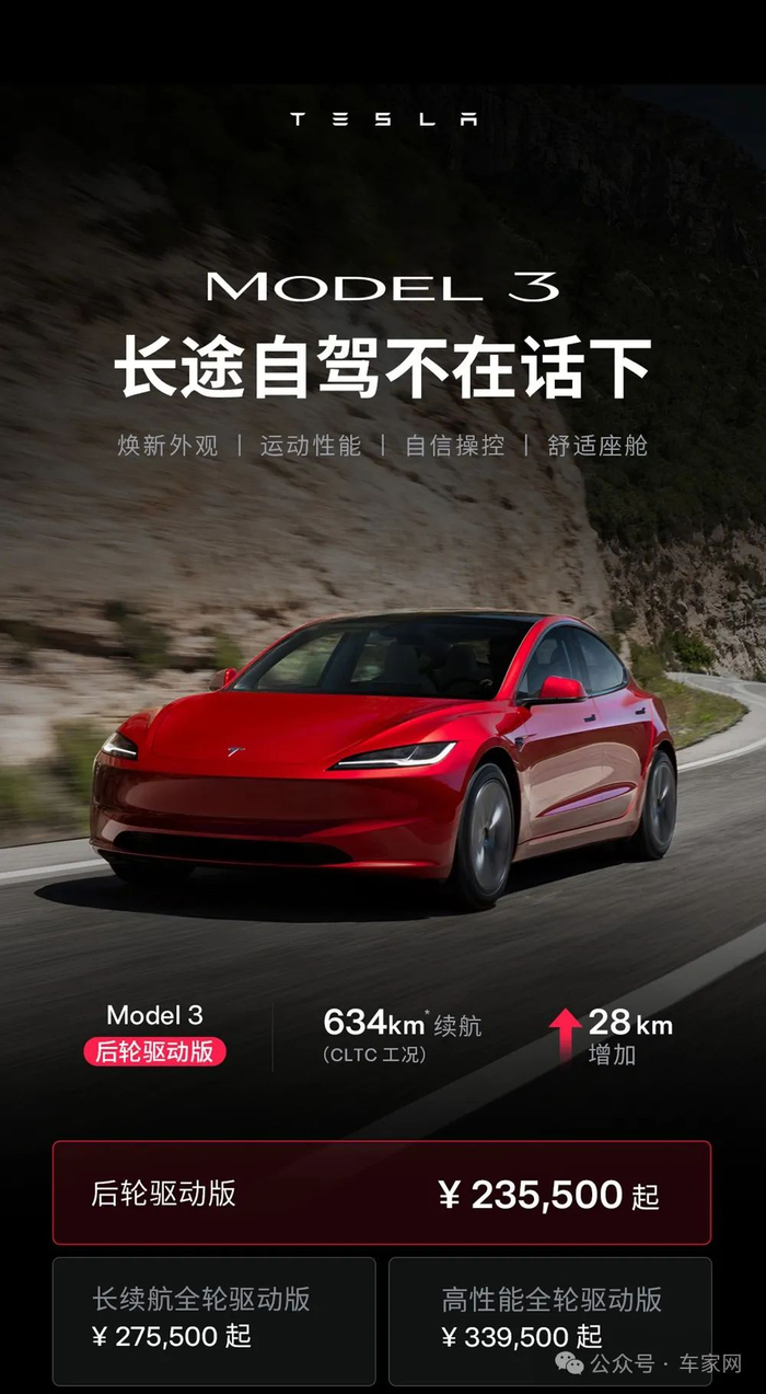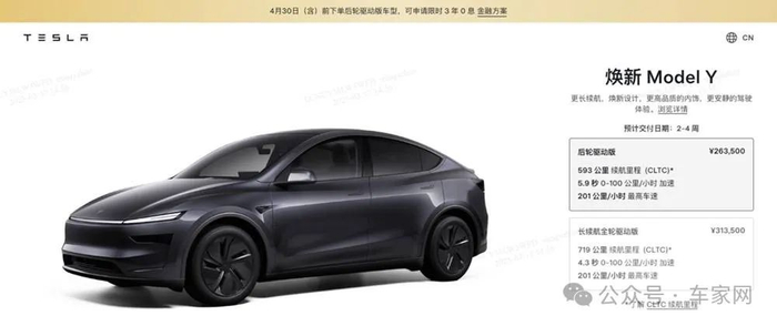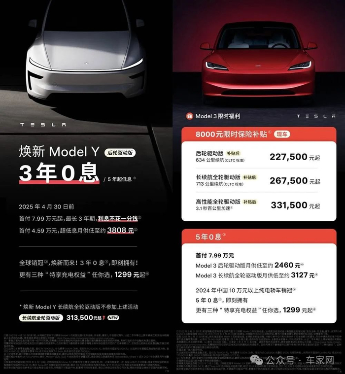 3月18日,特斯拉针对焕新Model Y和Model 3同时推出了重磅的限时政策:4月30日前,焕新Model Y长续航版涨价1万元,后轮驱动版推出3年0息和5年超低息政策,月供低至3808元。3月31日前,Model 3全系8000元现车保险补贴+Model 3后轮驱动版/长续航版5年0息政策,月供低至2460元。
