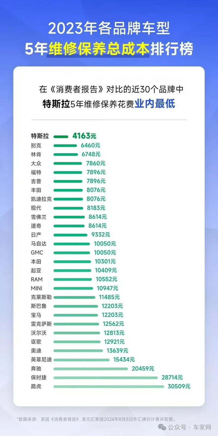 特斯拉最出名的特色,除了全球“五星安全”、“特别好开”(驾驶乐趣)以外,还有极低的养护成本——如果能用上谷电(部分地区低至0.28元/度电)为Model 3充电,花1块钱就能跑超过20公里,每公里补能成本不到燃油车的1/10。而且很多消费者反馈,特斯拉一年到头,除了更换空调滤芯,几乎不需要什么养护成本,美国《消费者报告》也指出,特斯拉5年维保花费业内最低。