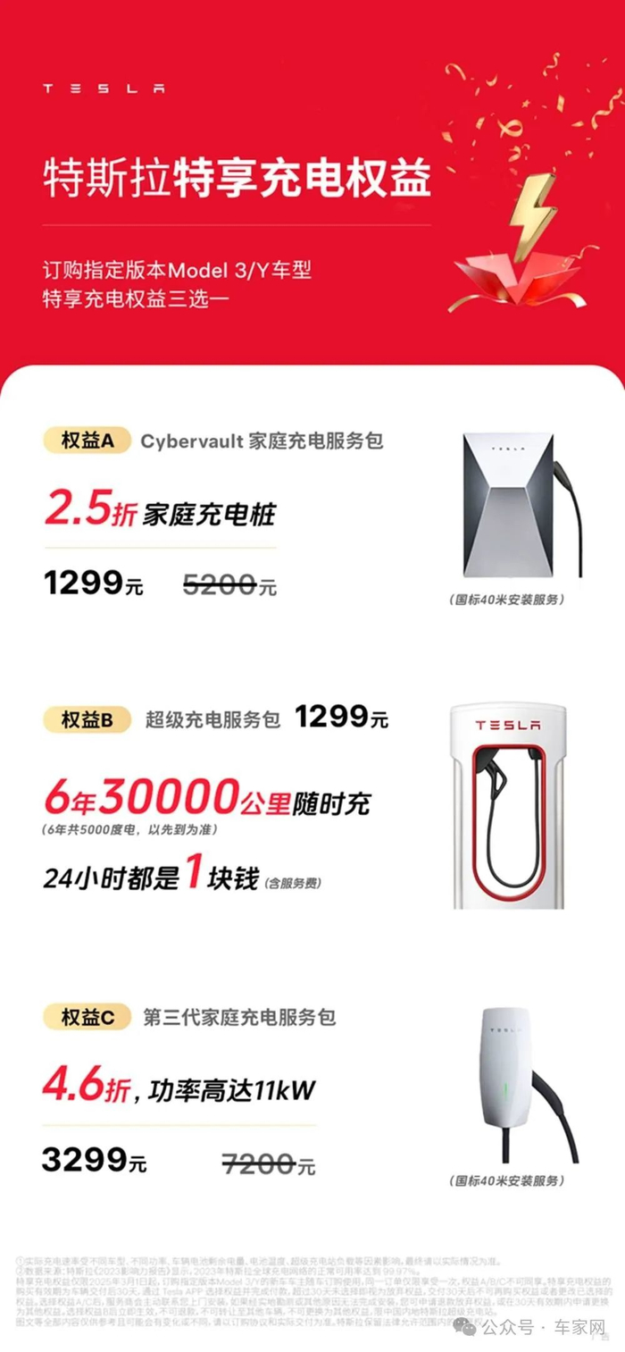 特斯拉还为Model Y新车主推出重磅充电权益:原价5200元的Cybervault家充桩2.5折,或6年3万公里(以先到者为准)超充24小时1块钱/度电,仅需1299元即可二选一,还可以3299元享受4.6折入手原价7200元的第三代家庭充电桩,充电功率高达11kW。特享充电权益的推出,让更多特斯拉车主在充电价格、效率、便捷性等方面免去后顾之忧,真正实现特斯拉充电比加油更方便。