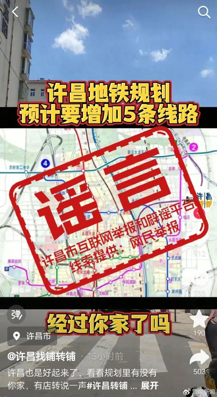 近日,许昌市委网信办接到网民举报,某平台账号“许昌找铺转铺的作品”发布了标题为“许昌地铁规划预计要增加5条线路,经过你家了吗”的视频内容。经向许昌市发改委查证核实,此信息为虚假谣言信息。