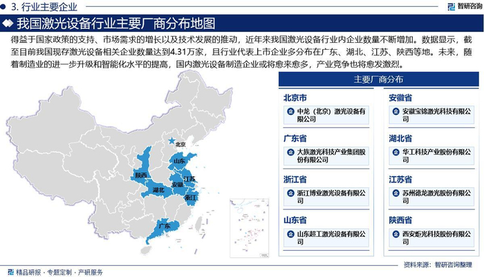 得益于国家政策的支持、市场需求的增长以及技术发展的推动,近年来我国激光设备行业内企业数量不断增加。数据显示,截至目前我国现存激光设备相关企业数量达到4.31万家,且行业代表上市企业多分布在广东、湖北、江苏、陕西等地。未来,随着制造业的进一步升级和智能化水平的提高,国内激光设备制造企业或将愈来愈多,产业竞争也将愈发激烈。