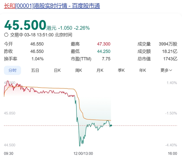 受宣布出售港口资产后的舆论影响,长和港股在3月18日午间大幅“跳水”,跌幅超过4.4%,至午间休盘期间报收44.75港币/股,市值一度蒸发超过78亿港币。下午股价有所回升。