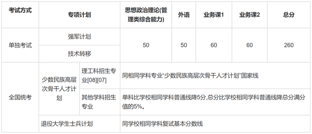 (4)“退役大学生士兵专项硕士研究生招生计划”:按照所报考院系(专业/研究方向)的复试分数线,总分线降10分,单科线不降。