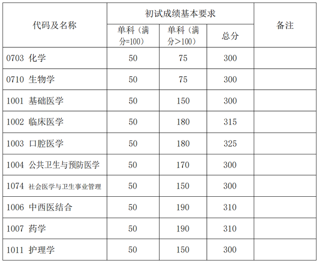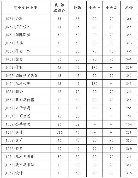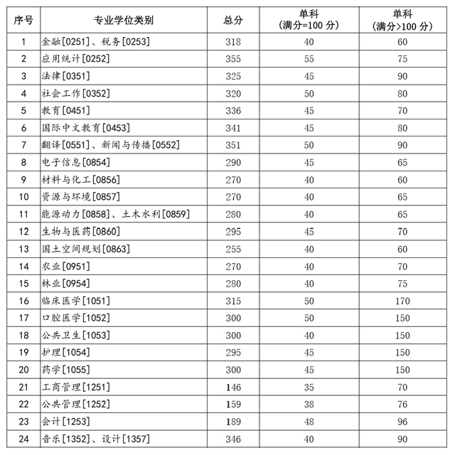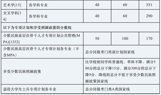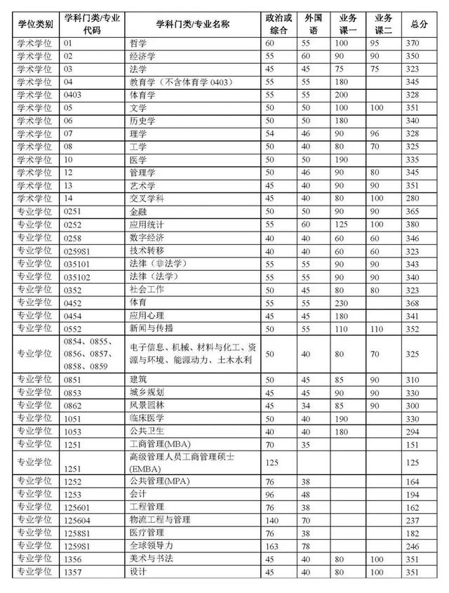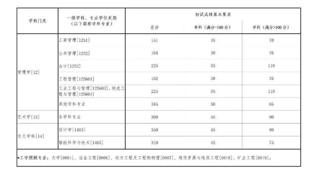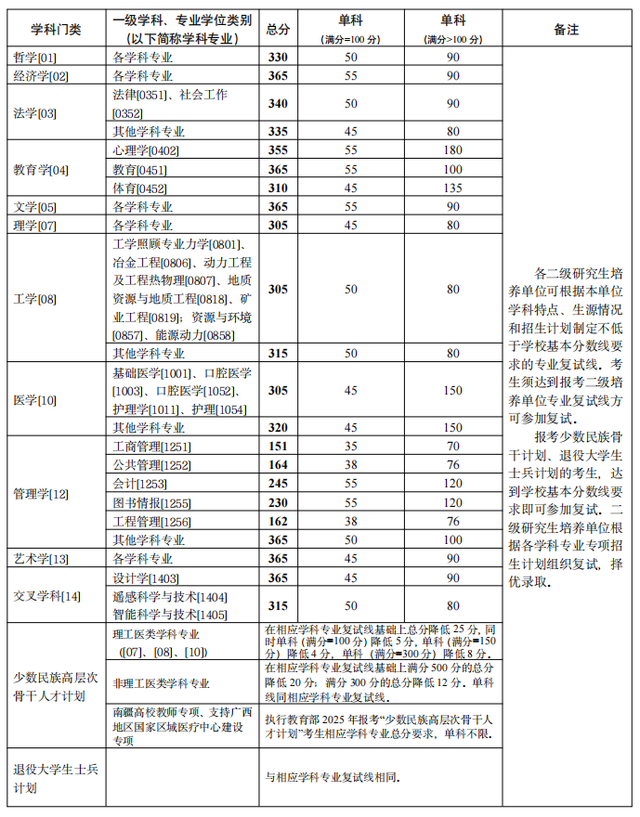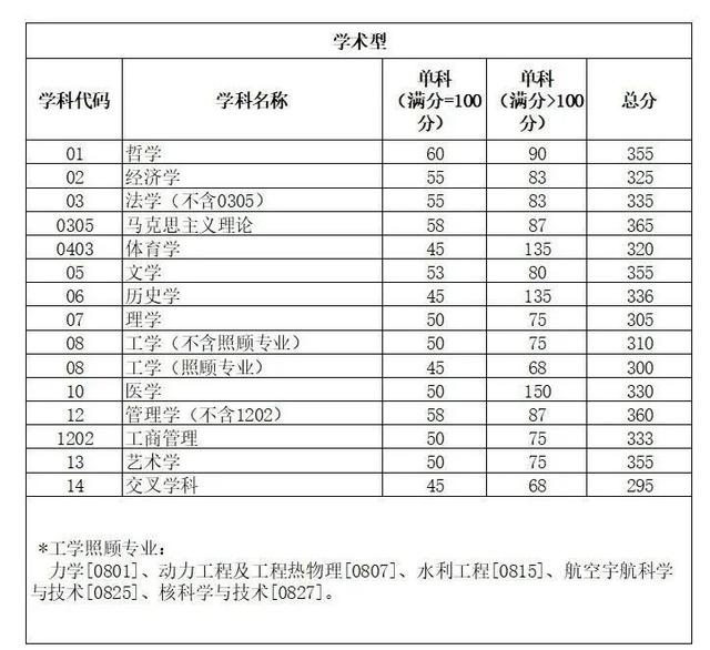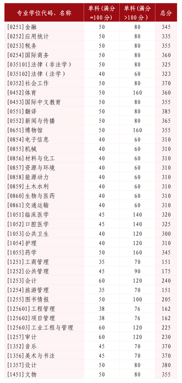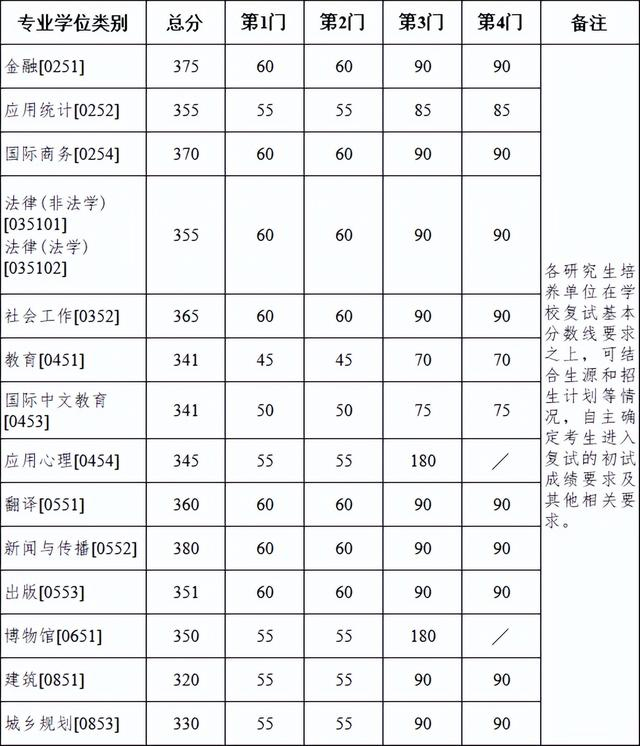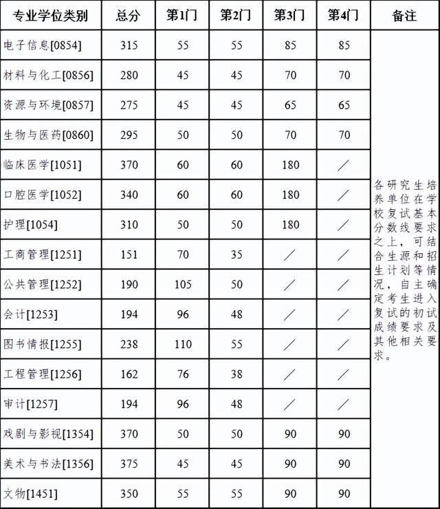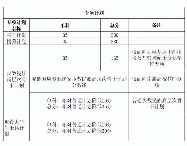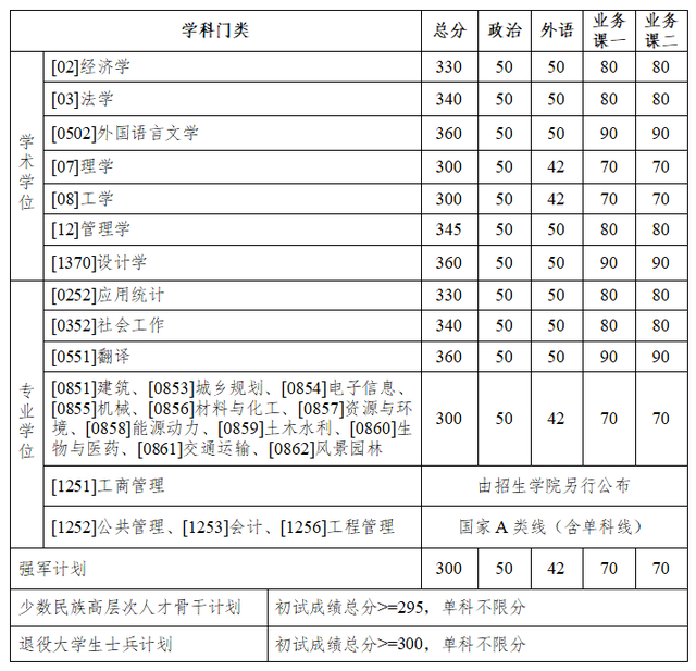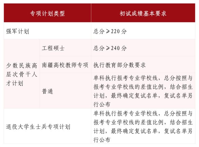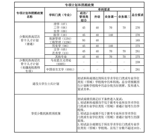 其中面向西藏地区“公共管理人才培养计划”专项,满分100分的单科成绩不低于40分、满分200分的单科成绩不低于90分、总分不低于160分;面向新疆喀什地区医学硕士专项,总分不低于235分,各单科成绩不作要求。