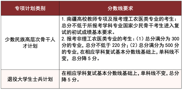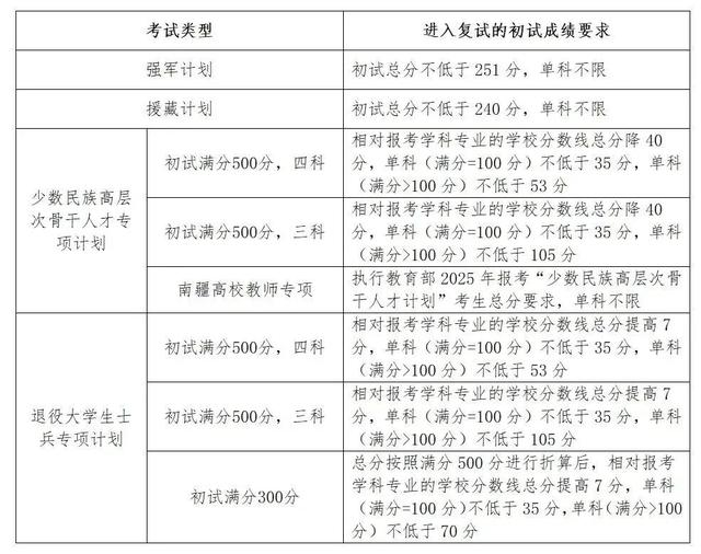 1.“少数民族高层次骨干人才计划(含南疆高校师资专项计划)”:总分不低于所报考学科专业国家少民骨干考生进入复试的初试成绩基本要求;单科成绩不低于所报考学科专业国家A类考生进入复试的初试成绩基本要求。
