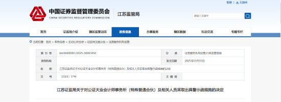 3月18日,江苏证监局发布公告,对公证天业会计师事务所(及其相关注册会计师(以下简称“天业会计”)采取出具警示函的行政监管措施,并将相关信息计入证券期货市场诚信档案。