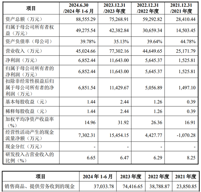 上述同期,公司销售商品、提供劳务收到的现金分别为23,850.85万元、38,788.87万元、74,416.65万元和37,033.78万元,经营活动产生的现金流量净额分别为-1,070.28万元、4,427.77万元、15,454.15万元和7,302.31万元。