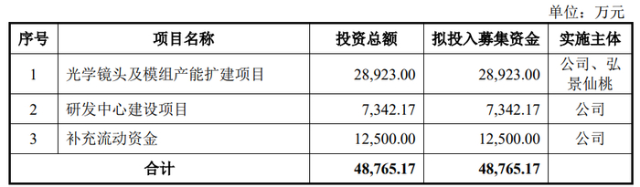 弘景光电本次发行募集资金总额为66,565.13万元,扣除发行费用后的实际募集资金净额为59,372.58万元,公司最终募集资金净额比原计划多10,607.41万元。弘景光电2025年3月10日披露的招股说明书显示,公司拟募集资金48,765.17万元,用于光学镜头及模组产能扩建项目、研发中心建设项目、补充流动资金。