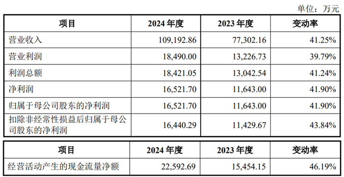 2024年度,弘景光电实现营业收入109,192.86万元,同比增长41.25%;实现净利润/归属于母公司股东的净利润16,521.70万元,同比增长41.90%;扣除非经常性损益后归属于母公司股东的净利润16,440.29万元,同比增长43.84%;经营活动产生的现金流量净额22,592.69万元,同比增长46.19%。