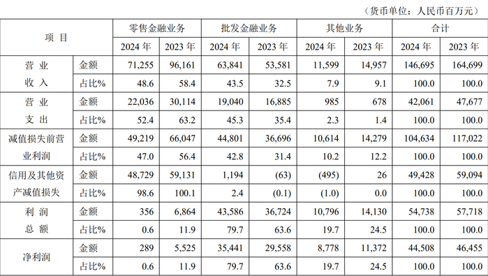 另一项值得关注的指标是,平安银行2024年信用及其他资产减值损失为494.28亿元,同比下降16.4%。其中,零售业务的信用及资产减值损失就高达487.29亿元。 银行的信用减值损失是银行调节利润的重要手段。平安银行2024年该指标下降表明资产质量有所改善,风险管理能力在提升。同时,尽管减值损失有所下降,但2024年平安银行净利润仍同比下滑4.2%,减值损失的下降幅度不足以抵消其他因素对利润的负面影响,可见盈利压力不小。