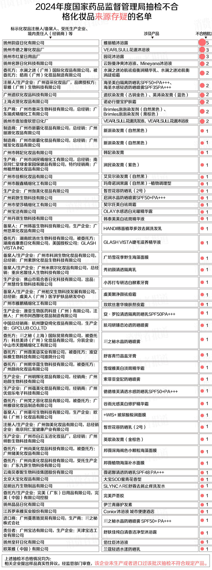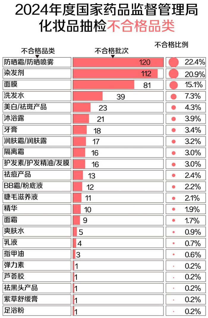可以说,防晒霜/防晒喷雾、染发剂、面膜这三类产品,已经占据了2024年不合格化妆品的半壁江山以上。