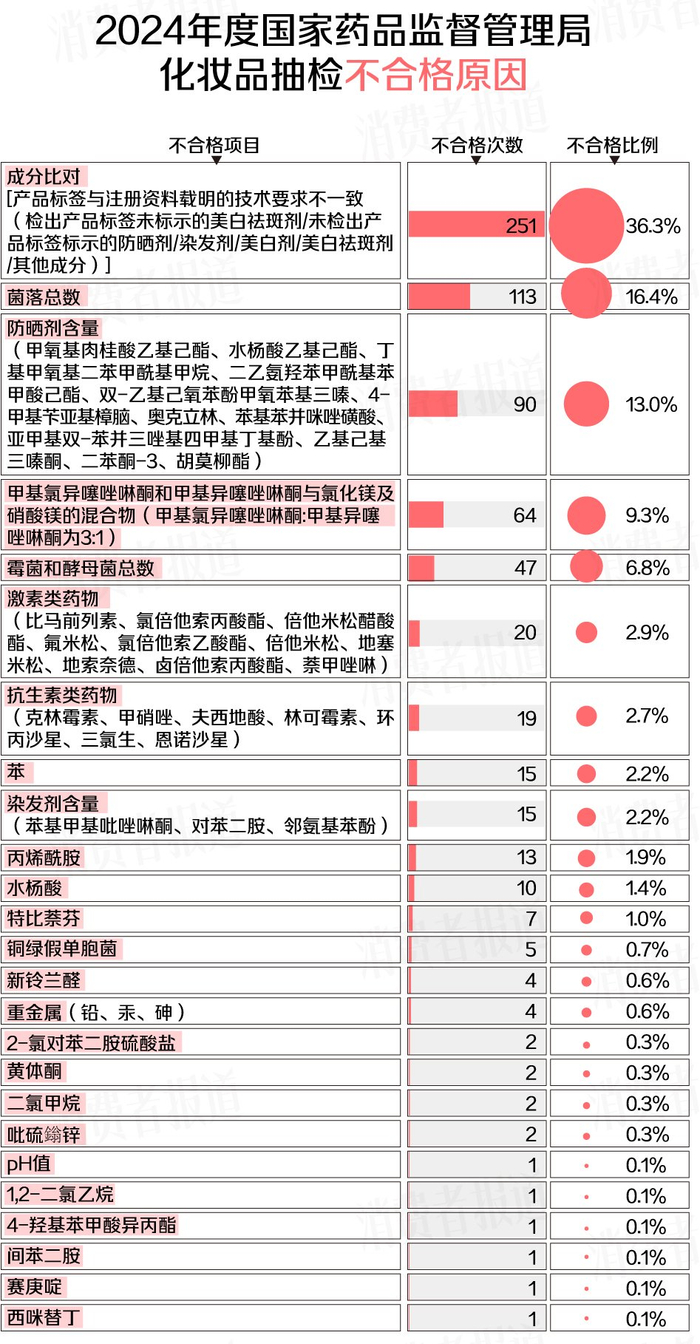然而,2024年全国化妆品的抽检结果恐怕要让成分党集体破防了!有些产品标称“天然植萃”却是“卡松超标的刺客”,宣称的“0添加”实则“激素超标”……《消费者报道》整理了国家药品监督管理局从2024年1月至2024年12月公布的化妆品抽检信息,对抽检不合格产品的种类、原因、品牌等方面进行分析,下面一起来看看。