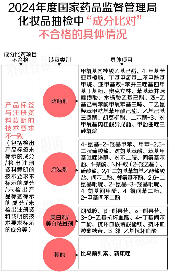 从成分比对不合格的具体项目来看,防晒霜、染发剂、美白/祛斑产品“猫腻”较多,错标和虚标有效成分(如防晒剂、染发剂、美白剂/美白祛斑剂)情况较集中。
