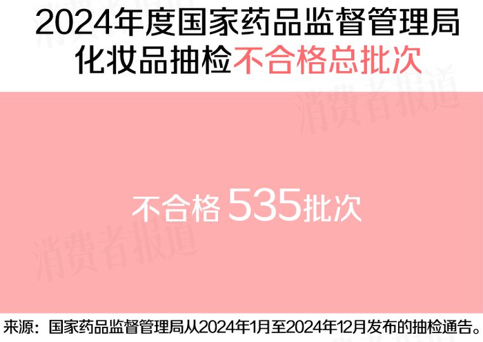经本刊统计,国家药品监督管理局在2024年发布了19条通告,一共公布了检出禁用原料、不符合规定化妆品总数量为535批次。