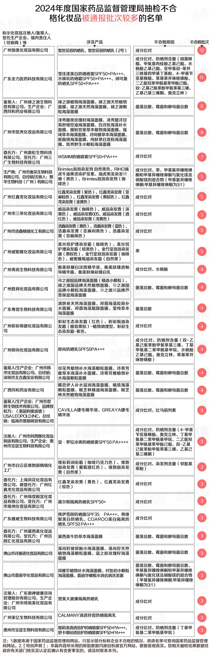 抽检结果显示,标称生产企业广州伽美化妆品有限公司频频登榜,其生产的皙世花容防晒乳(2号)等12批次产品,原因均为成分比对项目不合格,具体为未检出产品标签及注册资料载明的技术要求标示的多种防晒剂。紧随其后的是标称注册人/生产企业广东全力医药科技有限公司,同样在防晒产品上“翻跟头”,有11批次检出不合格,原因是成分比对项目不合格、防晒剂含量不达标。